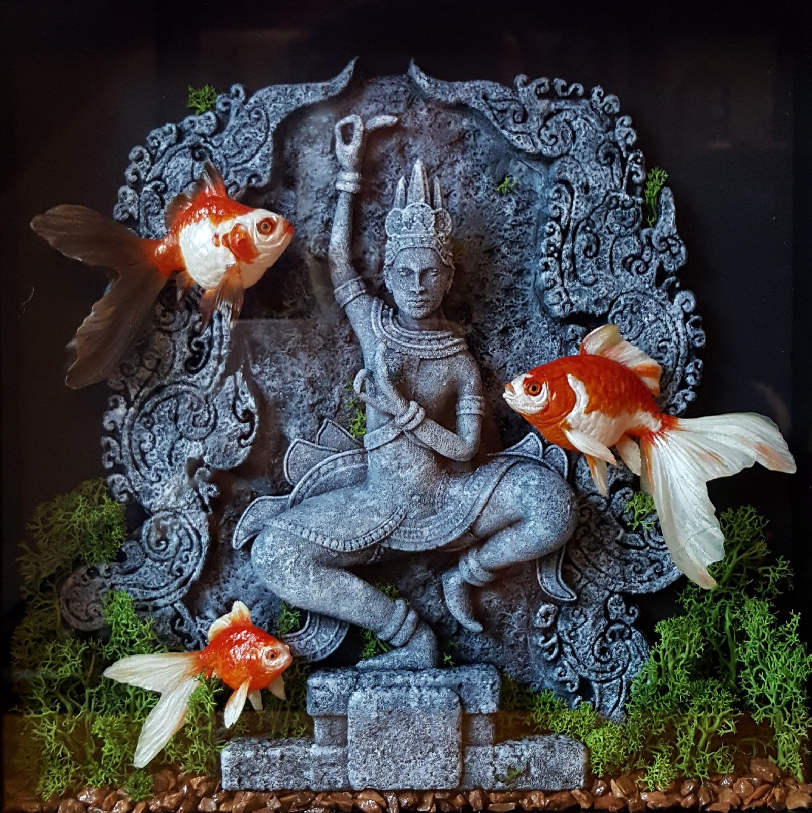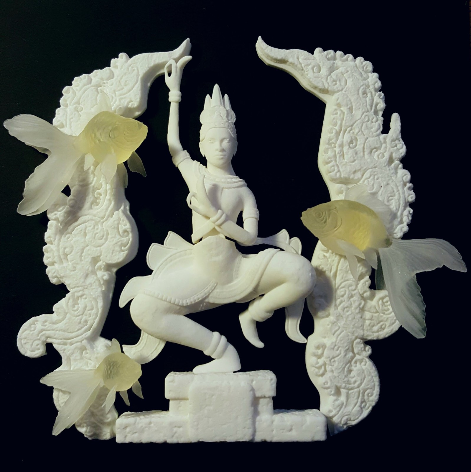 I was in charge of sculpting the dancer in the middle, so I loosely reproduced a traditional statue from Artisans d’Angkor portraying an Apsara dancer. I first modelled a base silhouette in Maya and sculpted the rest in ZBrush. Mony sculpted the fish and background fresque.